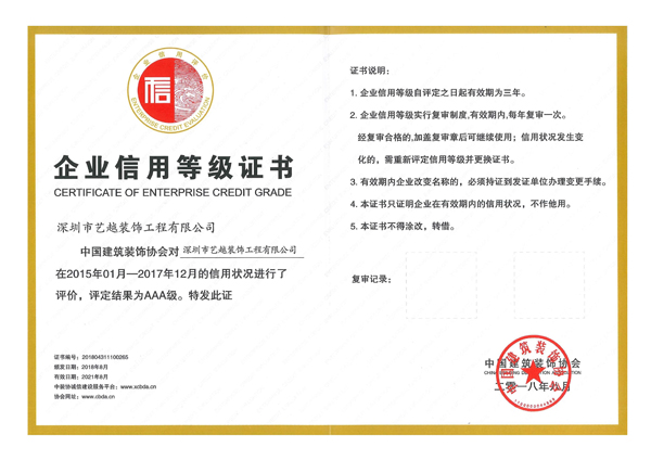该信用等级评价工作是中国建筑装饰协会对我司2015至2017年度信用状况的评价结果,是对企业信用状况的客观评定,更是行业协会对艺越装饰的认可。