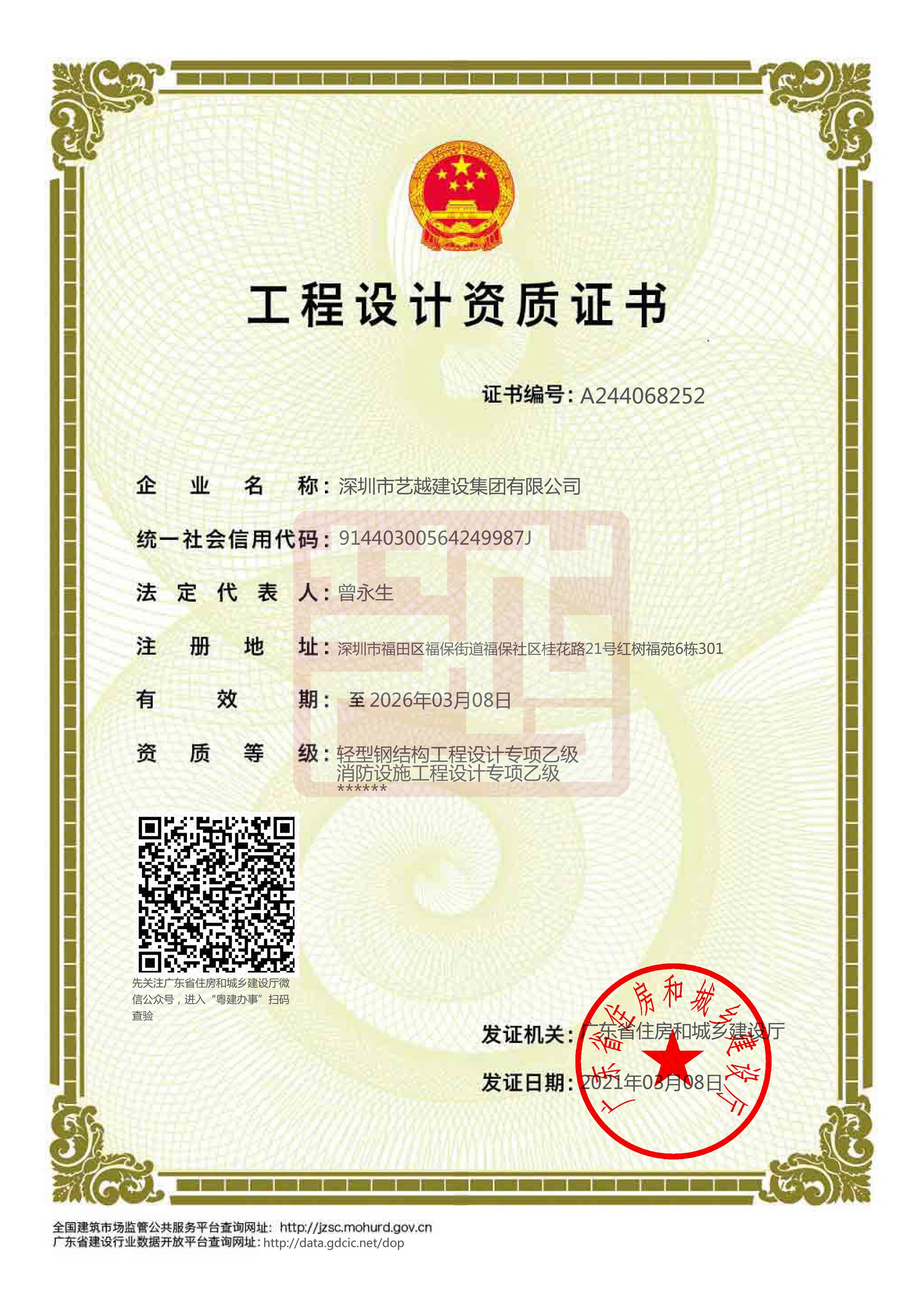在各级领导的关怀与全体人员的努力下,艺越建设集团申报的“轻型钢结构工程设计专项乙级”与“消防设施工程设计专项乙级”两项资质通过审核,成功实现晋升!
