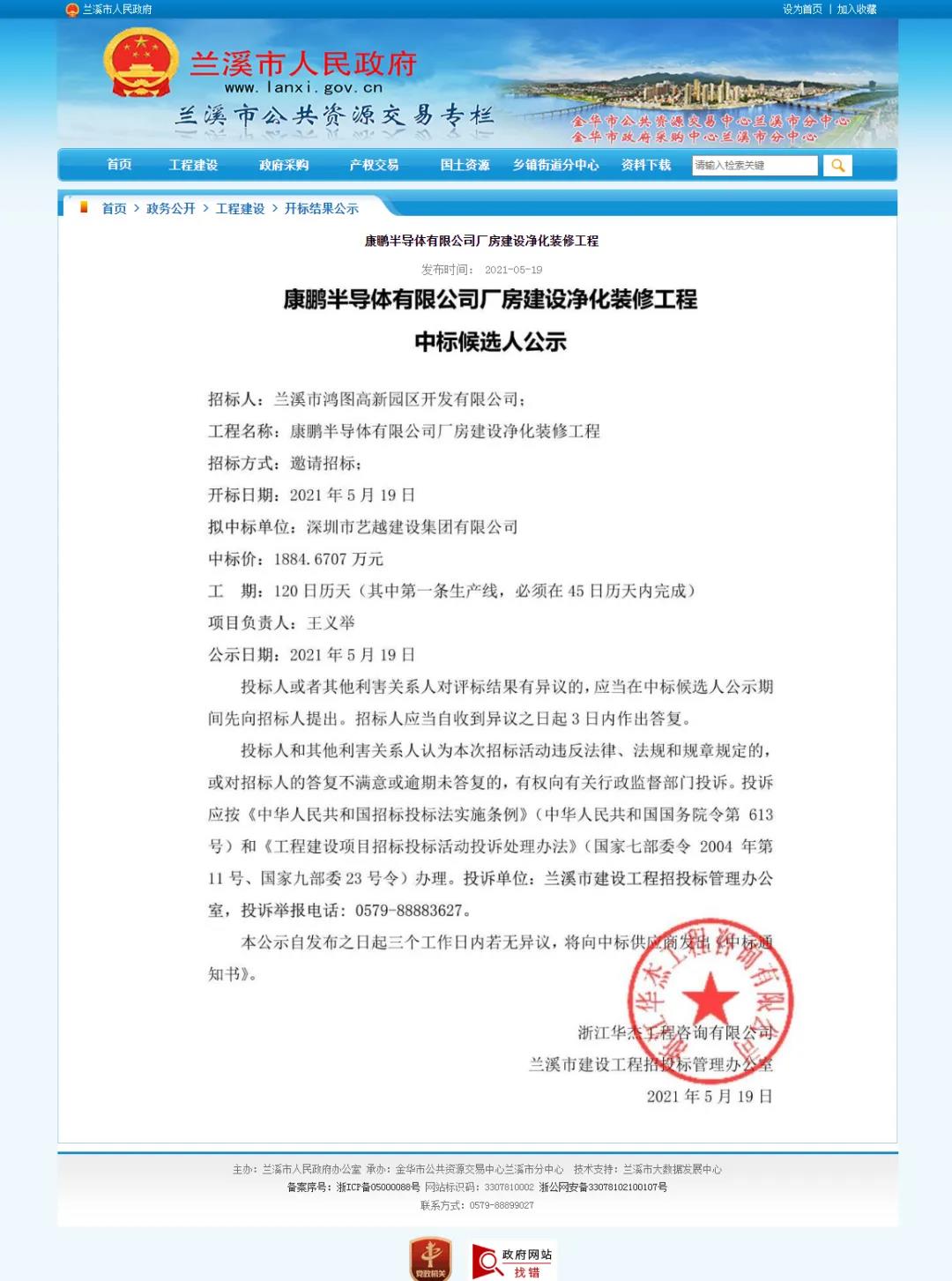 项目名称:浙江兰溪市康鹏半导体有限公司厂房建设净化装修工程;