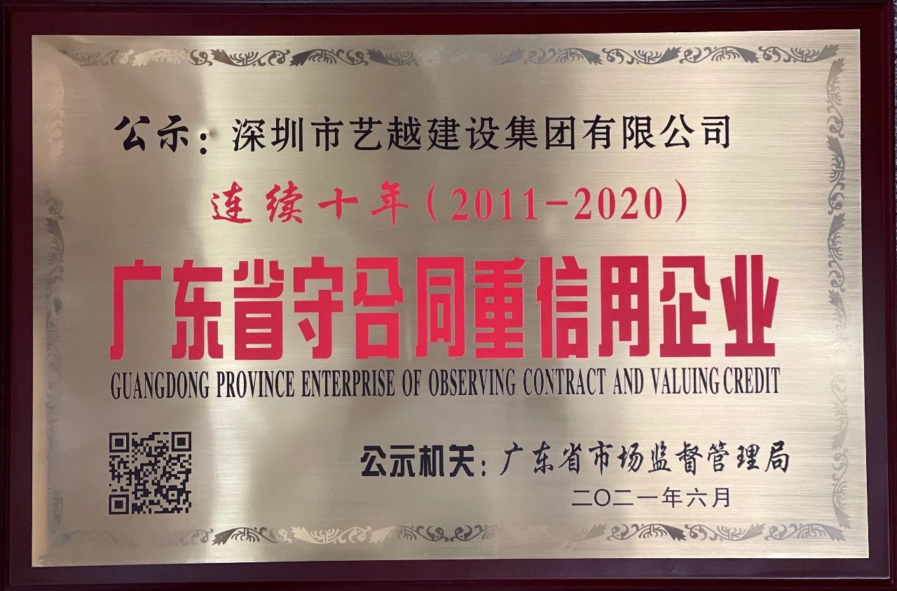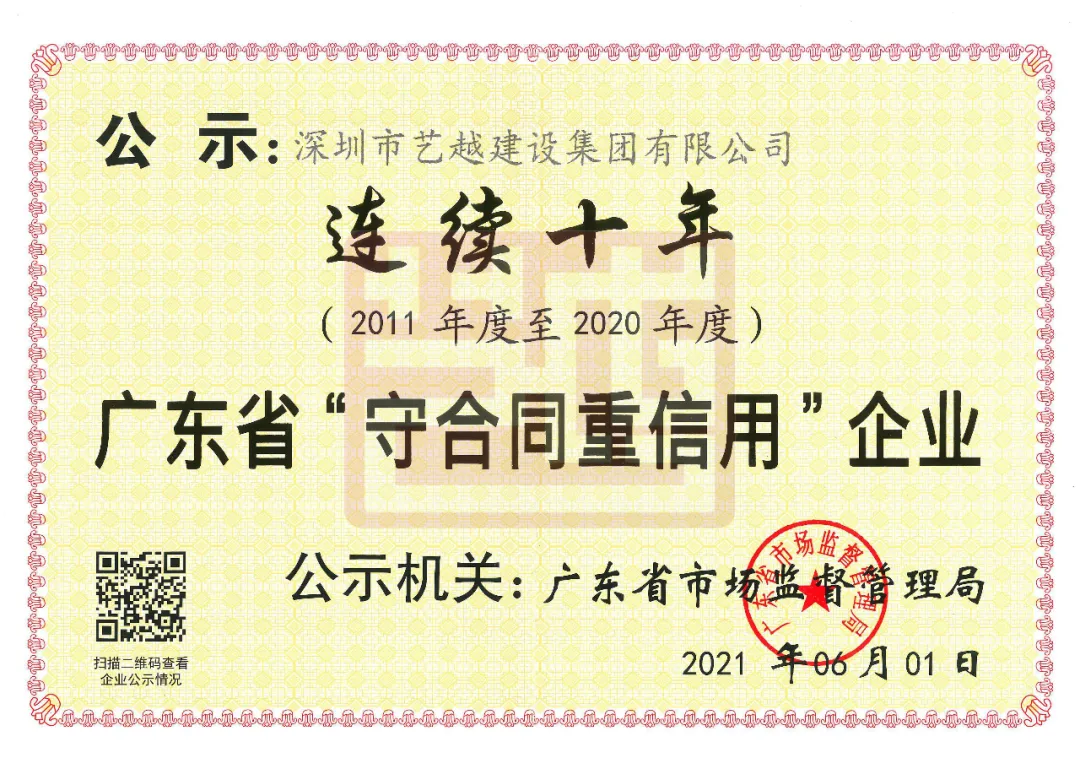 同时,在广东省市场监督管理局发布的2020年度“守合同重信用”企业公示中,艺越建设集团连续10年荣获广东省“守合同重信用”荣誉称号。