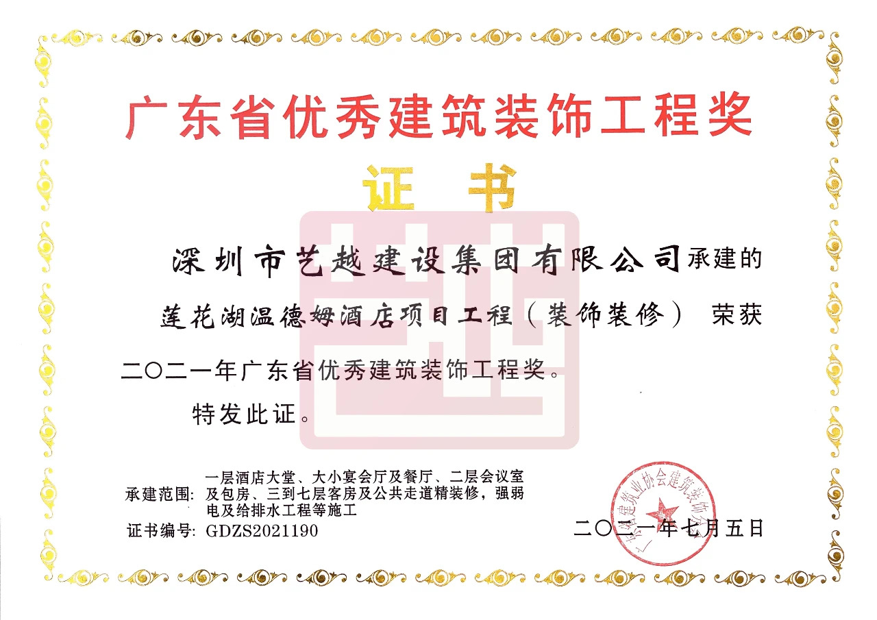 近期,艺越建设承建的“莲花湖温德姆酒店项目工程(装饰装修)”获得广东省建筑业协会建筑装饰分会颁发的“2021年广东省优秀建筑装饰工程奖”称号,为我司荣誉墙上再添新勋章!