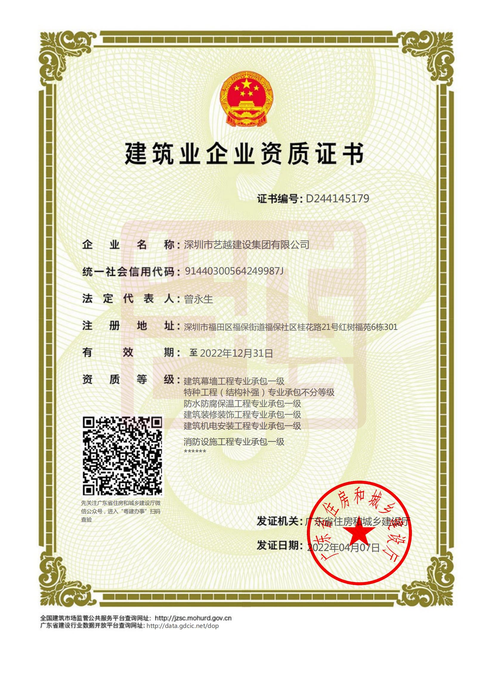 2022年4月25日,在各级领导的关怀和全体家人们的共同努力下,经广东省住房和城乡建设厅按相关规定核准,艺越建设集团荣获“消防设施专业工程承包一级”资质证书。