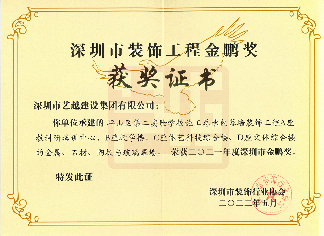 近日,在深圳市装饰行业协会发布的“2021年度深圳市装饰工程金鹏奖”评选结果公告中,由艺越建设承建的“坪山区第二实验学校施工总承包幕墙装饰工程”荣获“2021年度深圳市金鹏奖”,为我司奖项荣誉锦上添花!