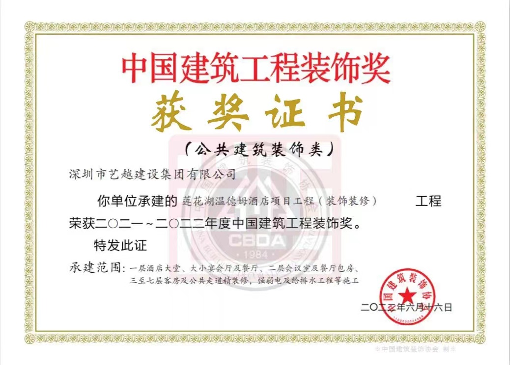 喜讯来临,在各级领导的关怀和全体家人们的共同努力下,由艺越建设承接的”莲花湖温德姆酒店项目工程(装饰装修)“荣获“中国建筑工程装饰奖”,为我司荣誉墙再添新的勋章!
