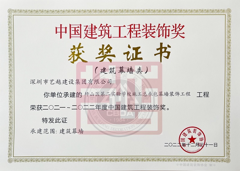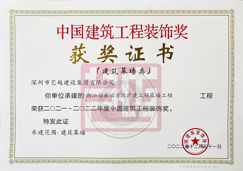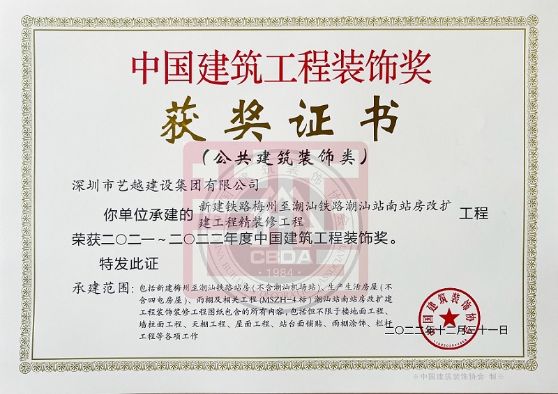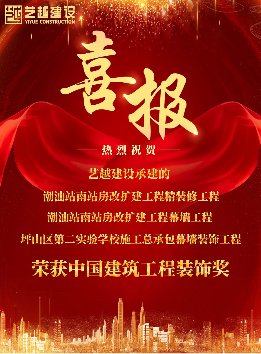 近日,备受关注的中国建筑装饰奖揭晓,由艺越建设承建的新建铁路梅州至潮汕铁路潮汕站南站房改扩建工程、潮汕站南站房改扩建工程幕墙工程、坪山区第二实验学校施工总承包幕墙装饰工程,荣获建筑装饰行业最高荣誉奖项——中国建筑工程装饰奖,为我司荣誉墙再添新勋章!