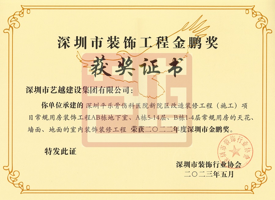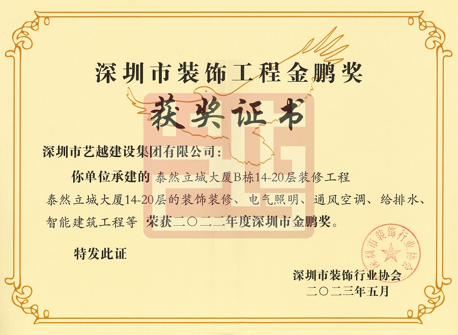 近期,在深圳市装饰行业协会发布的“2022年度深圳市装饰工程金鹏奖”评选结果公告中,由艺越建设承建的: