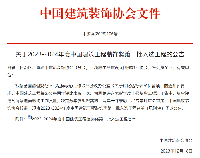 近日,2023-2024年度中国建筑工程装饰奖第一批入选工程评选结果揭晓,艺越建设两项精品工程荣获全国建筑装饰行业最高荣誉奖。