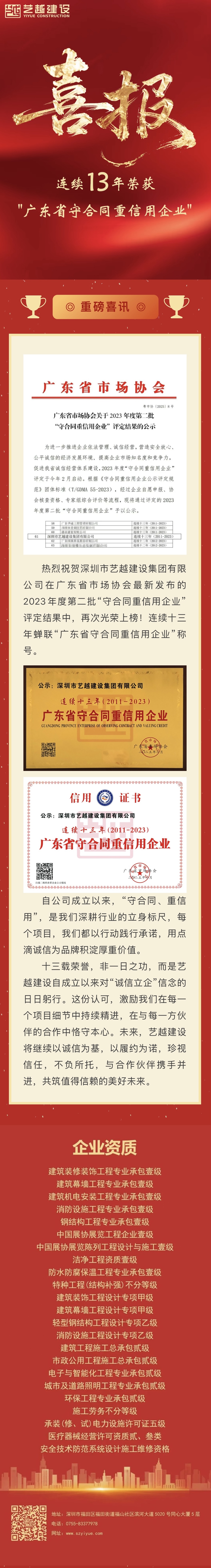 连续13年!艺越建设集团再获“广东省守信用重信用企业”称号
