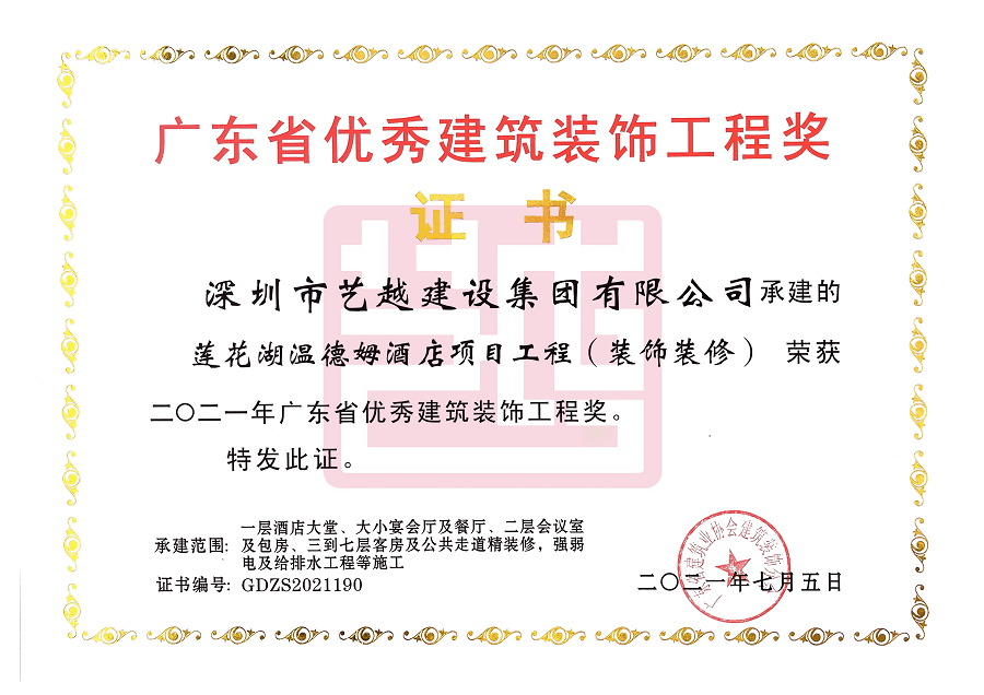 广东省优秀建筑装饰工程奖(茂名温德姆酒店)