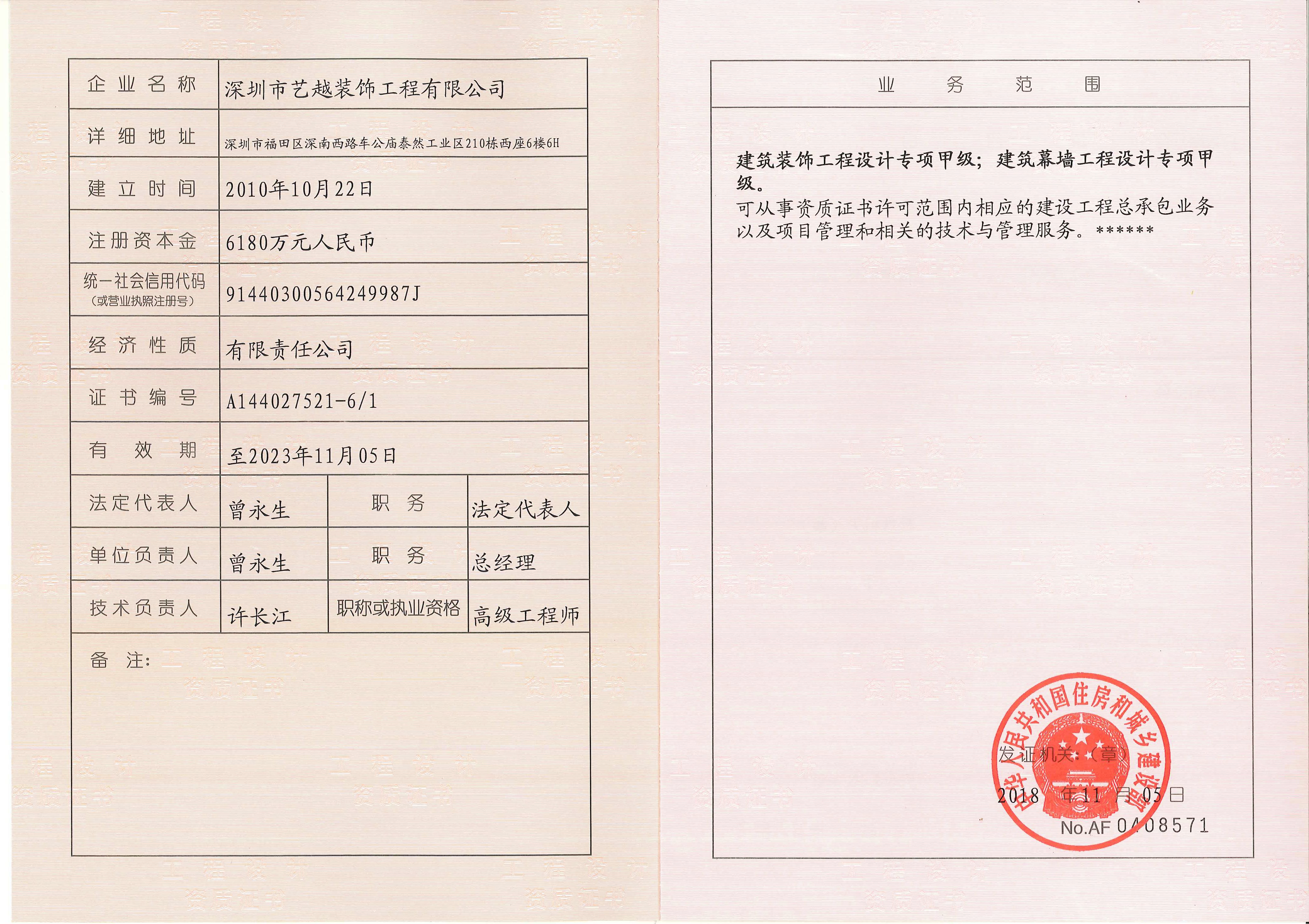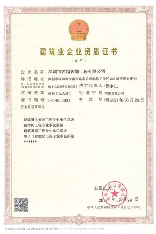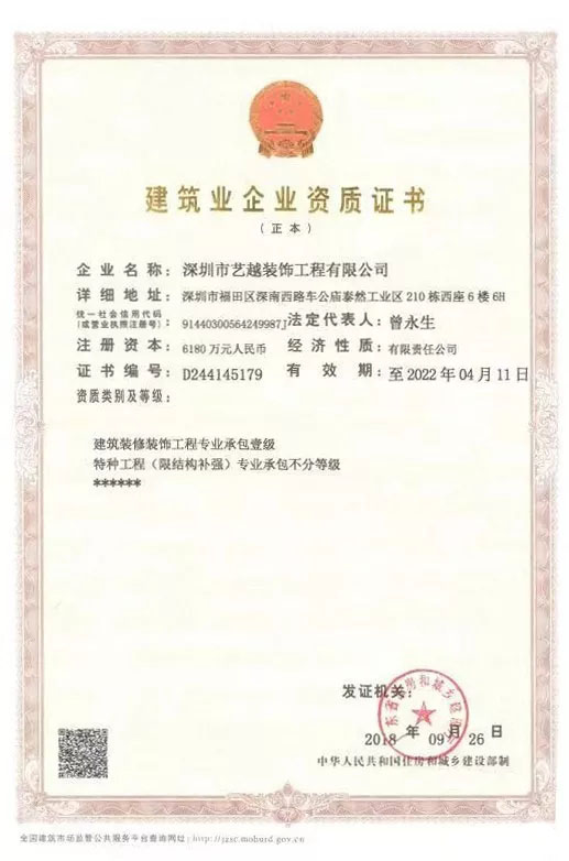 艺越装饰不断提升服务经营理念,致力于成为全方位引领行业服务品质的标杆企业。在资质平台建设上再次取得了新的进展,成功取得特种工程结构补强专业承...