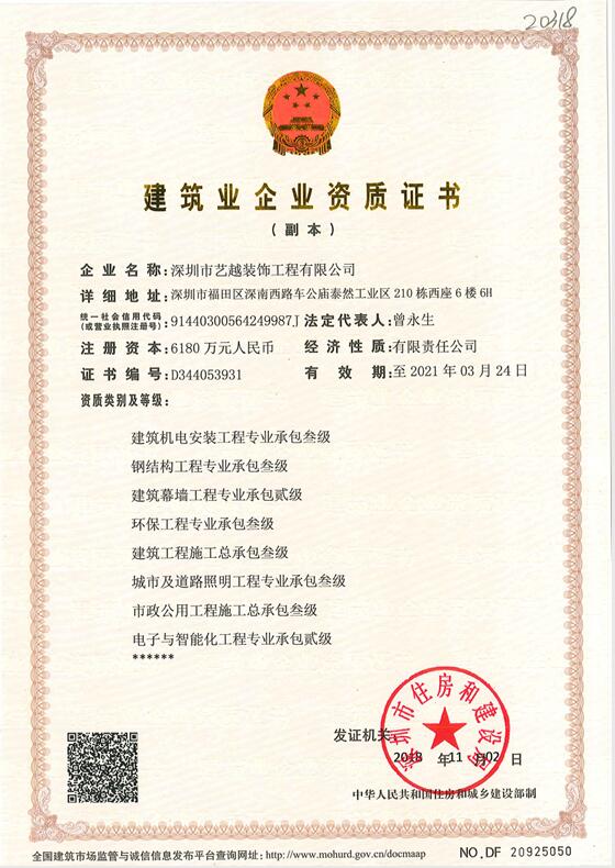在各级领导的关怀与全体同仁的共同努力下,艺越装饰资质平台建设取得了新的进展,新申办的电子与智能化工程专业承包贰级资质成功获得审批。